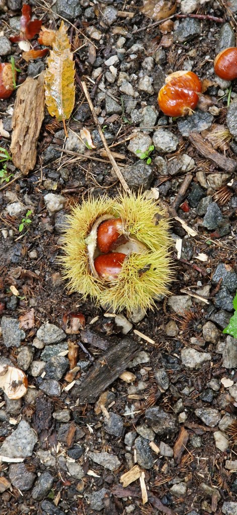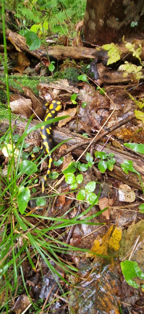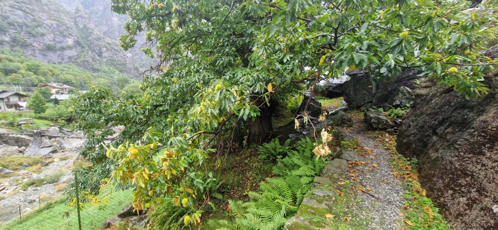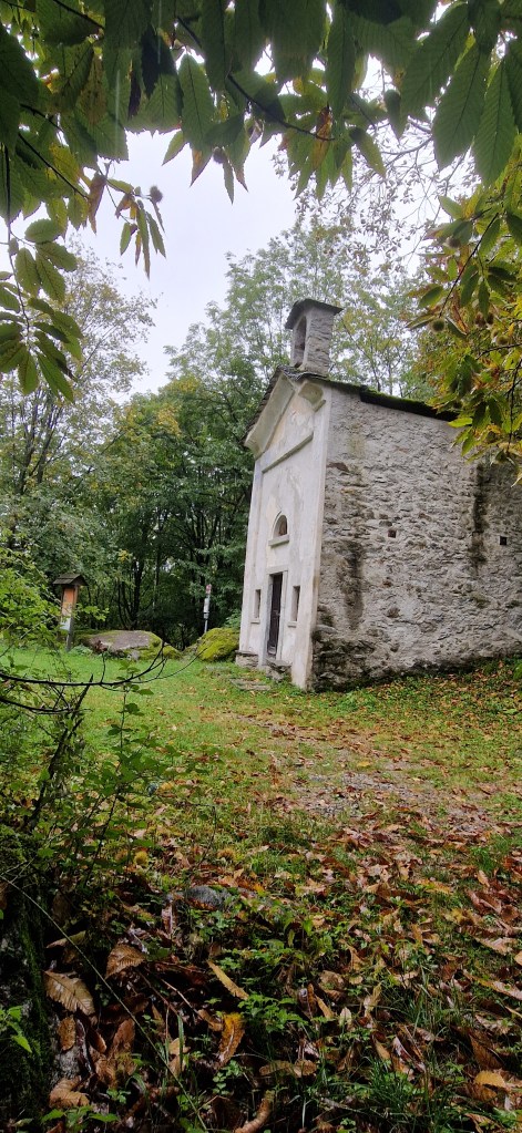 Die restliche Truppe machte sich auf den Weg nach Chiavenna. Kurz danach war es einem Bauarbeiter zu verdanken, dass wir auf dem richtigen Weg blieben. Er zeigte uns den Abzweiger, denn der Wegweiser wurde durch sein Fahrzeug verdeckt. Die folgenden Kilometer zeigten sich von der abwechslungsreichen Seite. Kastanienbäume, Feuersalamander, davonfliegender Regenhut und ein zerfallenes Haus, welches uns trockenen Unterschlupf für den Mittagsrast bot.