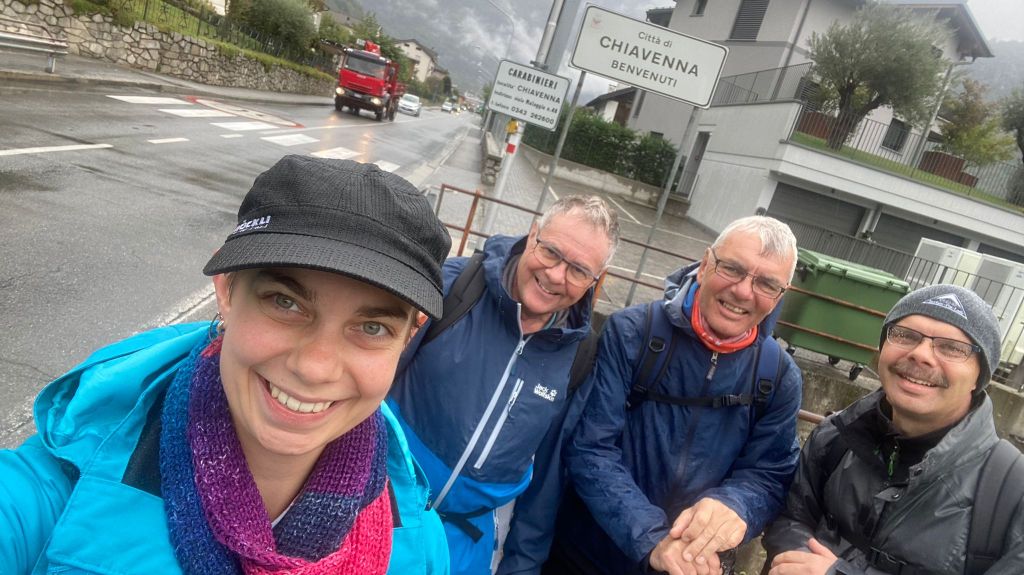 In Chiavenna zeigten die Wanderschilder eine andere Richtung an als unsere Karte. Dies bereitete uns nur wenig Kopfzerbrechen, da die allgemeine Richtung stimmte. Allerdings war die Umleitung länger als der normale Weg und unser Ziel, den 17 Uhr Bus zu erreichen wurde immer sportlicher. Victoria und Stefan nahmen die Zügel in die Hand und sprinteten Richtung Chiavenna Bahnhof. Beat und mir blieb nichts anderes übrig, als Schritt zu halten und die aktuelle Geschwindigkeit per Wanderapp zu verfolgen…6km/h. Mit winkenden Armen von Victoria wurde dem Buschauffeur angezeigt, dass noch mehr Fahrgäste mit wollen.