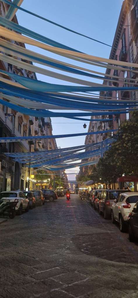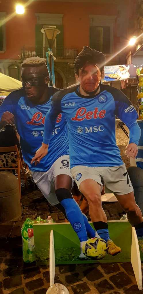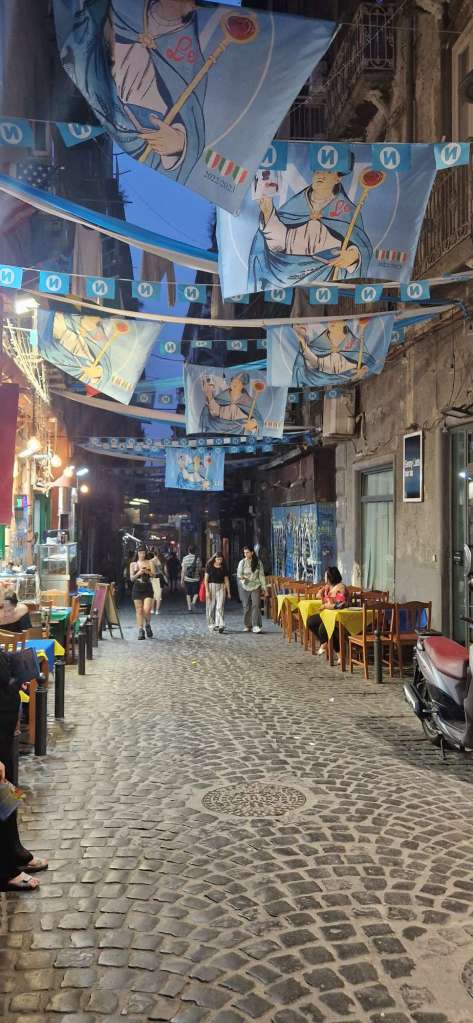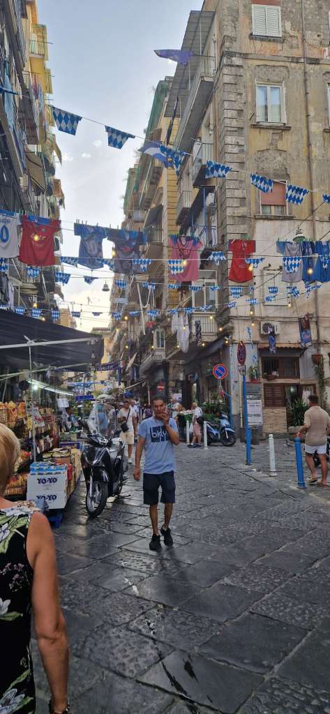 Übrigens wurde Napoli diese Saison zum dritten Mal Fussballmeister in Italien. Die ganze Stadt ist voller Plakate und Fahnen und es gibt noch einen zusätzlichen Heiligen…Maradona…überall findet man Portraits oder Wandgemälde von ihm.