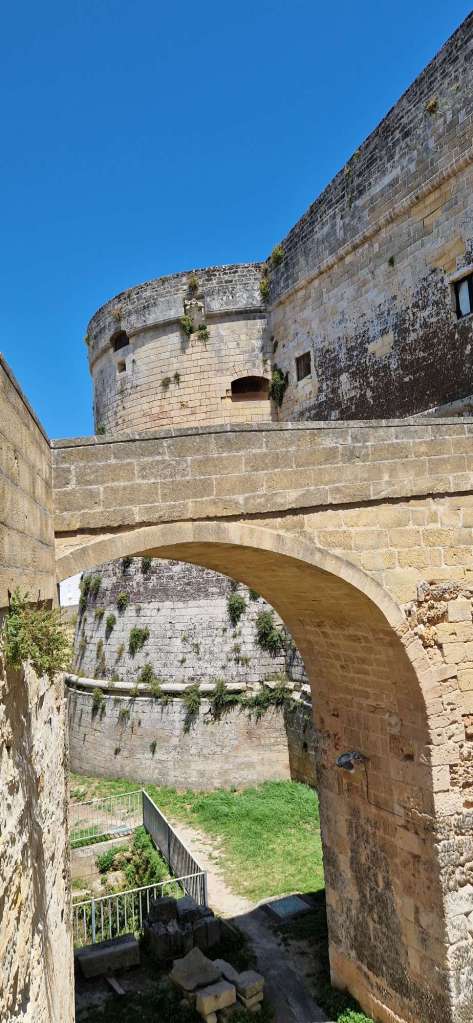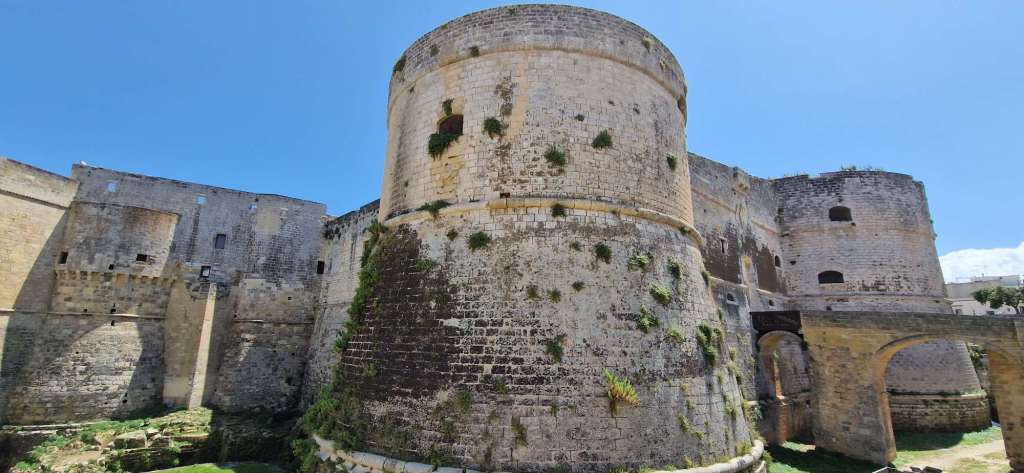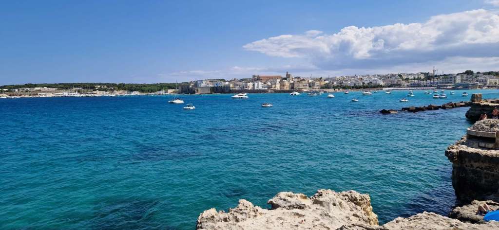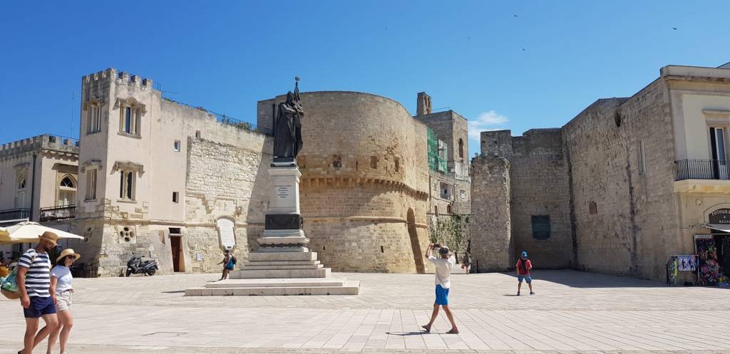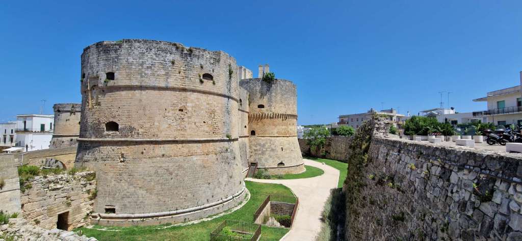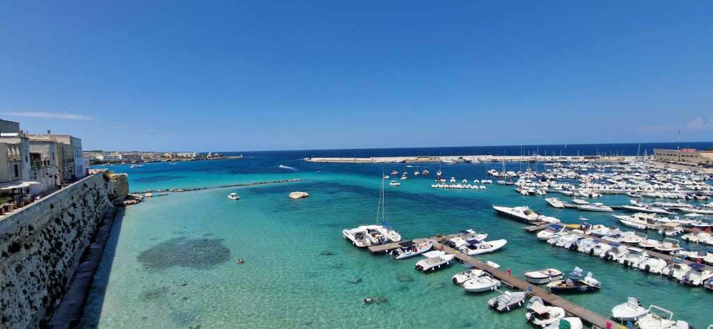 Otranto, eine schöne alte Stadt die mit einer mächtigen Stadtmauer umgeben ist. Sandbänke im Hafen lassen das Meer türkisblau erscheinen und locken hunderte von Besuchern an.