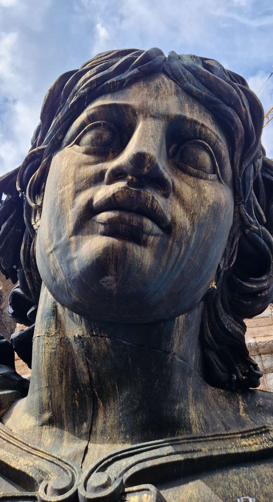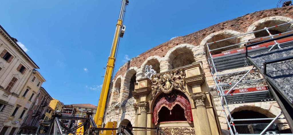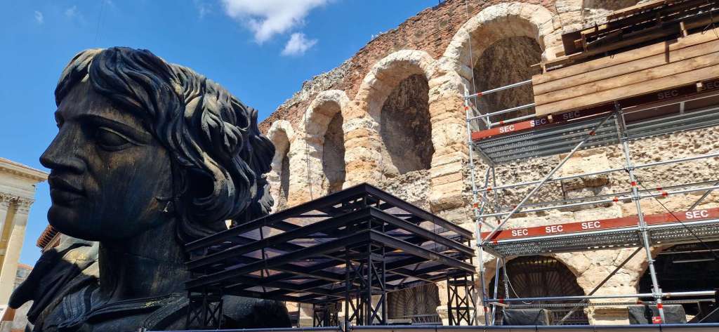 Vom Taxistand aus war die Arena von Verona schon sichtbar. Beindruckendes Gemäuer von aussen…leider ist alles überstellt von Requisiten für die verschiedenen Opern, denn die Festspiele finden zur Zeit zum hundertsten mal statt. Unglaublich mit wieviel Aufwand jeden Tag umgebaut wird. Mit einem mobilen Kran werden die einzelnen Teile über das Gebäude in die Arena gehievt.