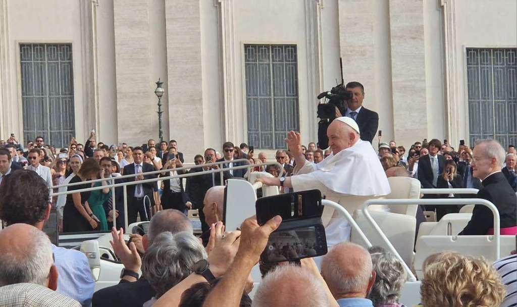 Ein Raunen ging durch die Menge, die Leute standen auf und klatschten…der Papst musste irgendwo unterwegs sein…kurz darauf fuhr das Fahrzeug auf die Bühne und Franziskus nahm Platz und eröffnete die Audienz.