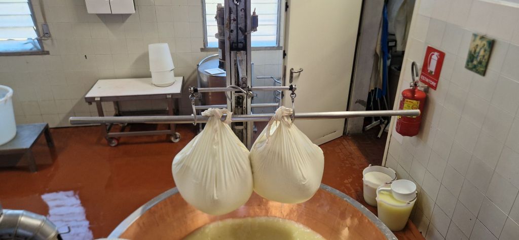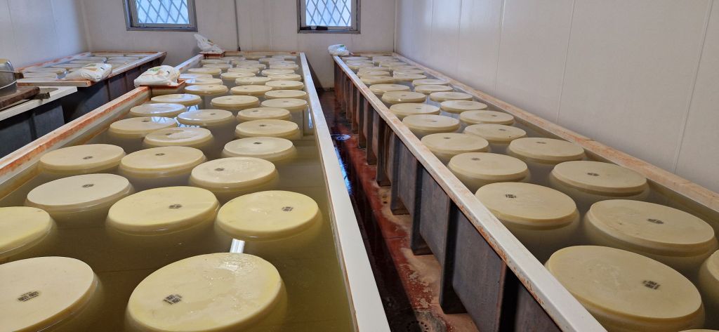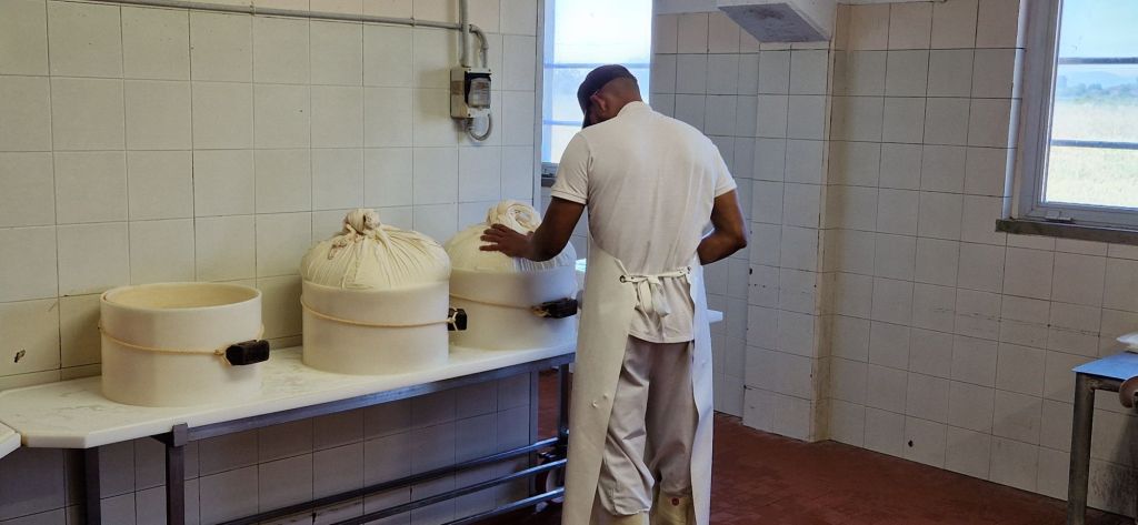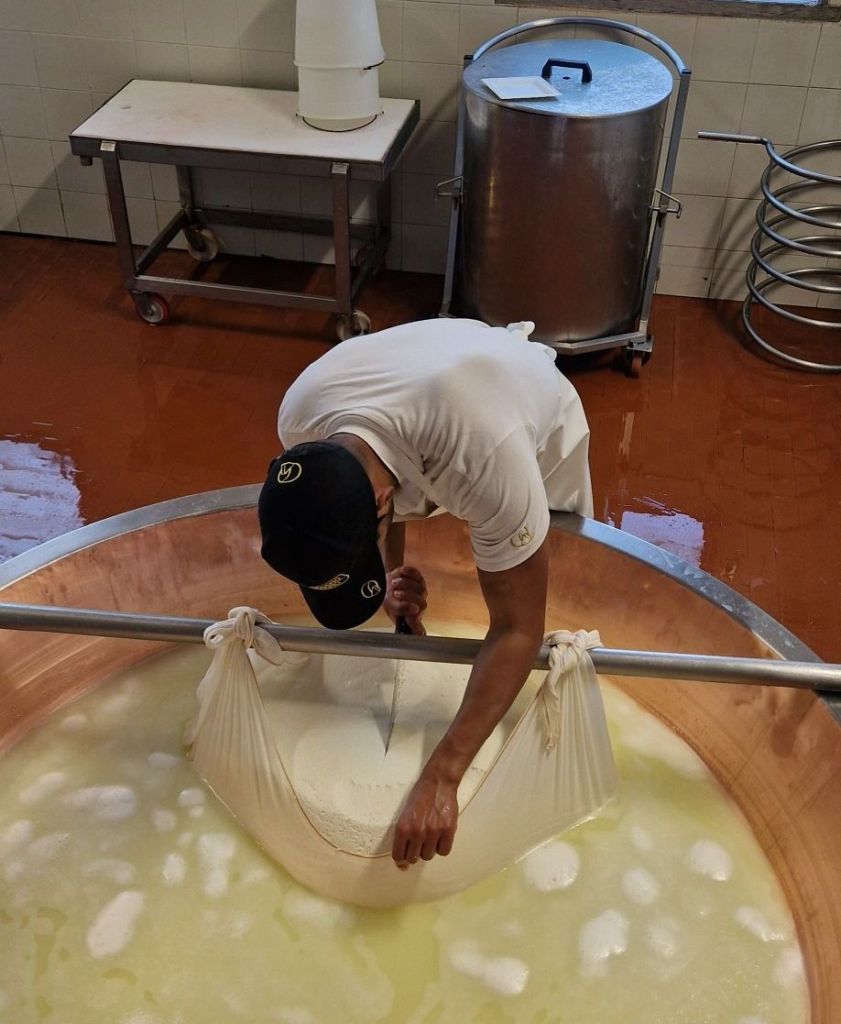 Die Kühe werden morgens und abends gemolken. 50% Abendmilch und 50% Morgenmilch werden gemischt und zu Käse verarbeitet. Der Hof produziert im Schnitt 5 Laibe pro Tag. Pro Laib (50kg) benötigt man 550l Milch. Übrigens wird die Molke, welche dabei entsteht, den Schweinen gefüttert, welche für den Parmaschinken gezüchtet werden.
