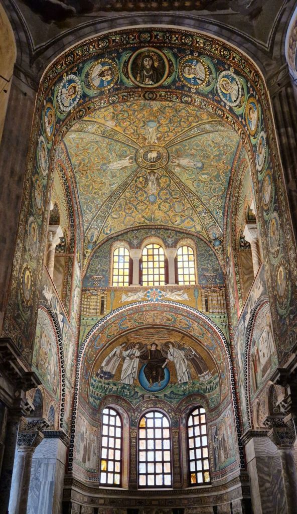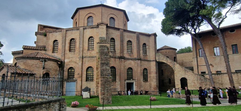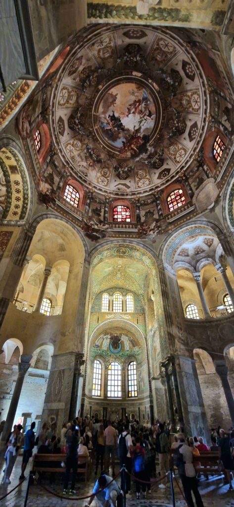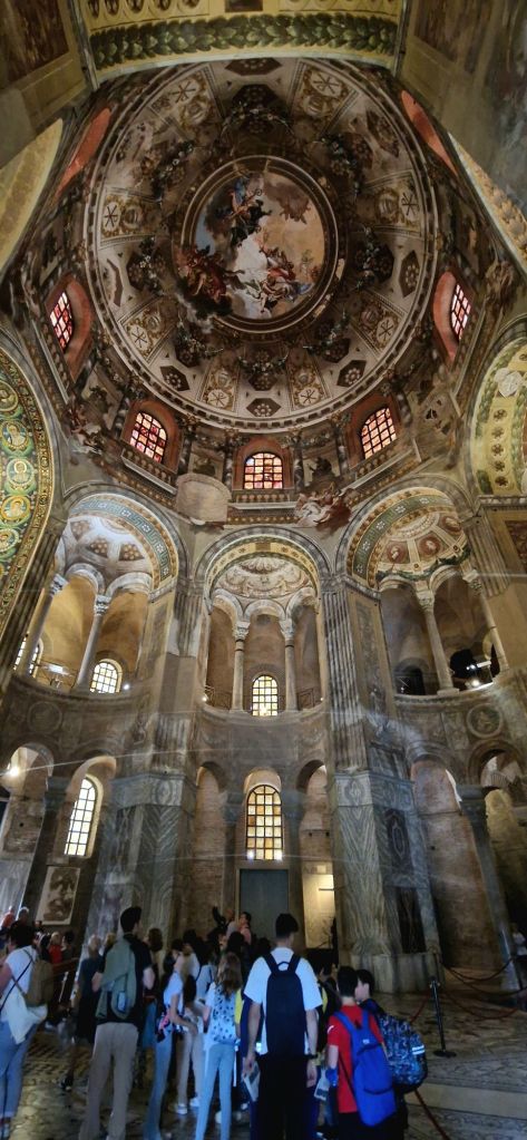 Wir besuchten die Basilica di San Vitale, welche 537 – 547 gebaut wurde. Dieser achteckige Bau ist von aussen schon recht eindrücklich anzusehen, aber wenn man einmal drin ist, kommt man aus dem Staunen nicht mehr heraus. Der gewaltige Innenraum ist mit Mosaiken und Fresken verziert.
