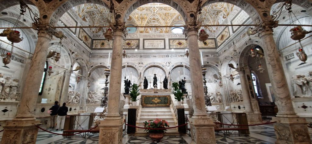Da der Regen nicht aufhören wollte, fuhren wir zurück ins Hotel und zogen die Regenklamotten an. So ausgestattet kehrten wir zurück und besichtigten die Kirche. Sie ist zwar gross und besitzt im Innern 20 Kapellen, aber es gibt Schönere.