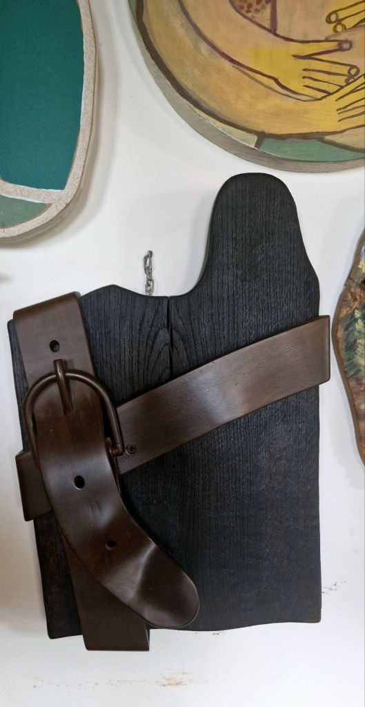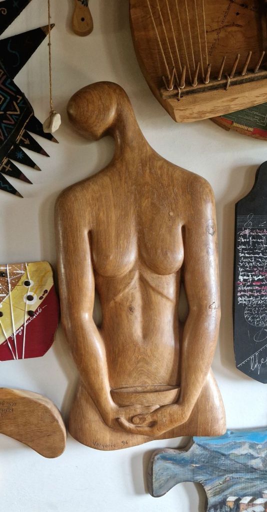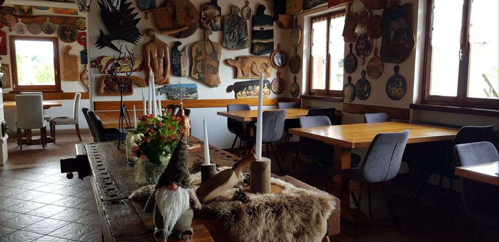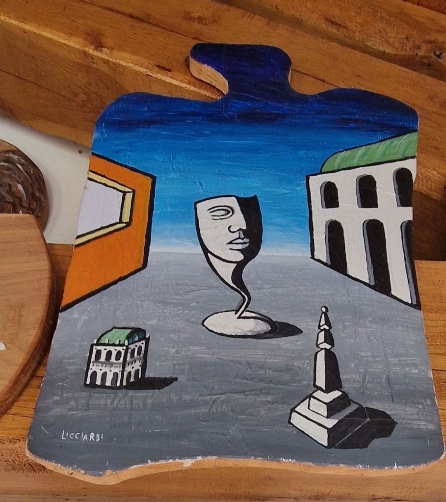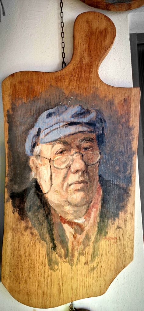 Vor zig Jahren, fing einer an, als Gastgeschenk ein solches Servierbrett zu bemalen. Dem folgten weitere Gäste und Künstler aus aller Welt, so dass wohl gegen 300 solcher Tagliere im Essraum aufgehängt sind.