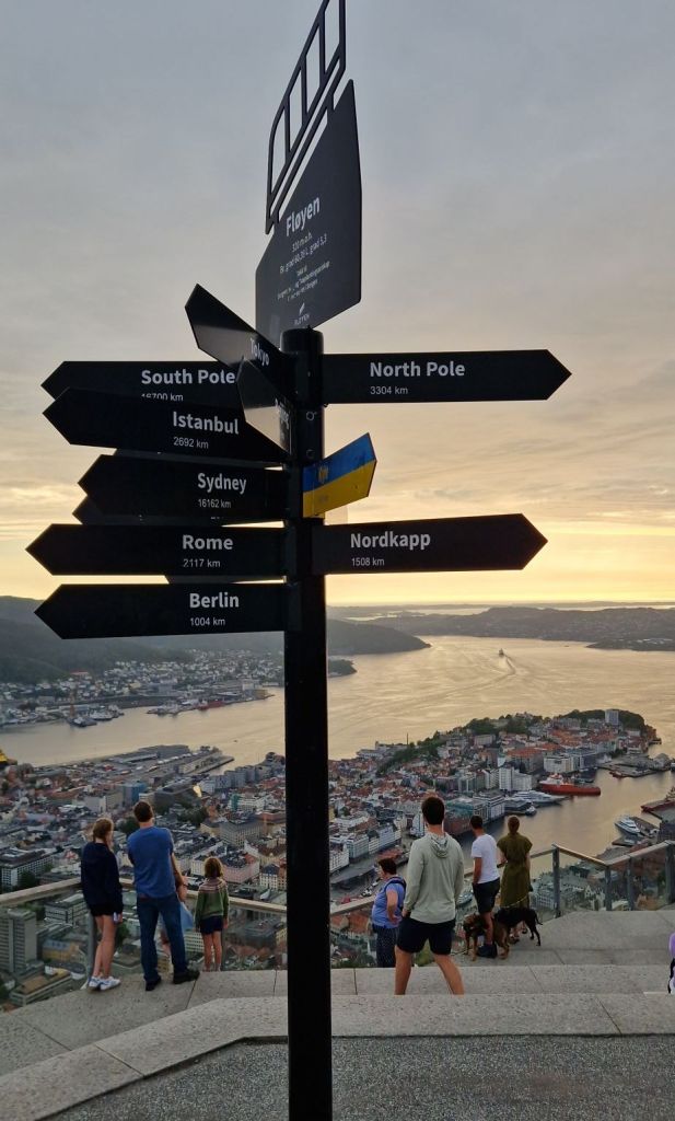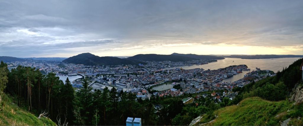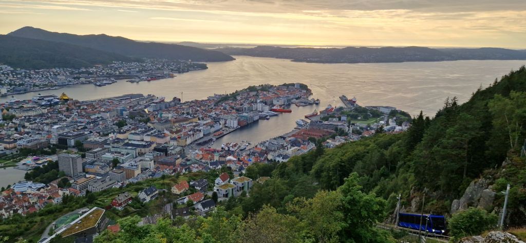 Da unsere Koffer um 17 Uhr noch nicht im Hotel eingetroffen waren, suchten wir ein Restaurant zum Abendessen. Kein leichtes Unterfangen, wenn noch ein Kreuzfahrtschiff vor Anker liegt. Hat dann doch noch geklappt und zum Ausklang des Tages fuhren wir auf den Floyen, den Hausberg von Bergen.