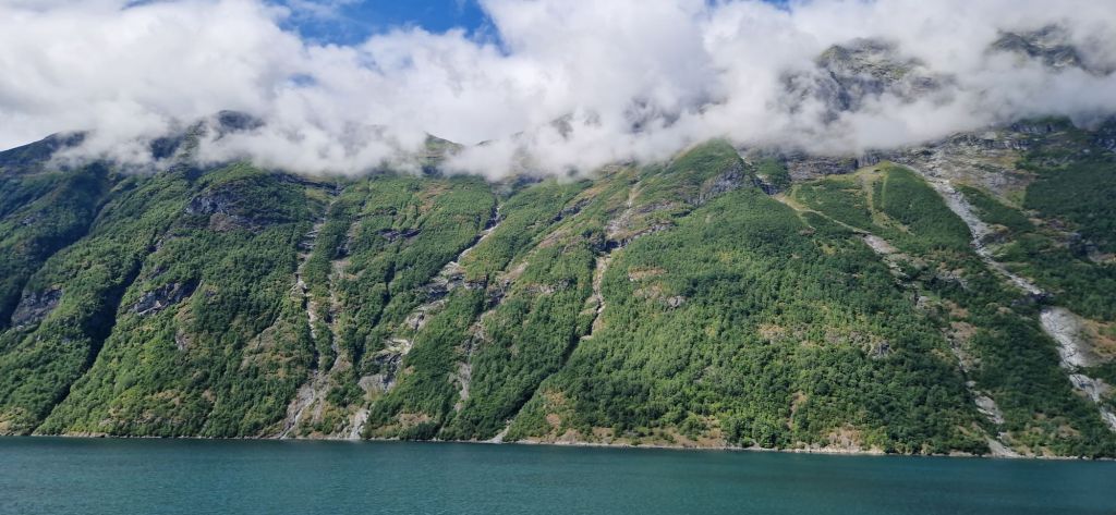 Nach einer guten Nacht aufgewacht und festgestellt, dass das Schiff ein bisschen schaukelt. Der Blick nach draussen brachte nichts, da Nebel die Landschaft einhüllte. Enttäuschend, denn heute stand mit dem Geirangerfjord ein erstes Highlight auf dem Programm.