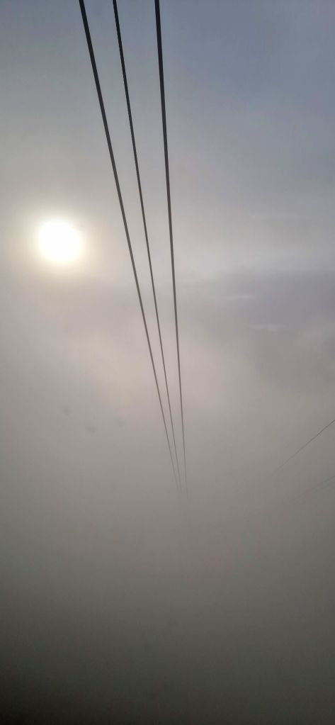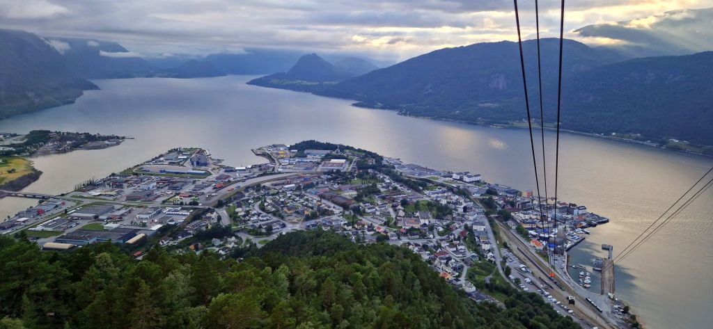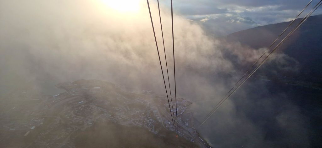 Zum Abendessen durften wir mit der Gondel in Andalsnes auf den Berg Nesaksia fahren. Der Nebel trübte unsere Sicht, aber nicht unsere Laune.