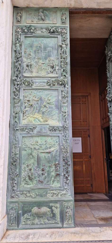 Zum Schluss erfuhren wir interessante Details zum Dom und der Taufkirche. Die Taufkirche hat drei Bronzeportale aus dem 14. und 15. Jahrhundert welche einen Höhepunkt der Bildhauerkunst darstellten. Erstmals wurden dreidimensionale Bilder hergestellt. Heute sind die Originale in einem Museum ausgestellt und durch vergoldete Bronzekopien ersetzt.