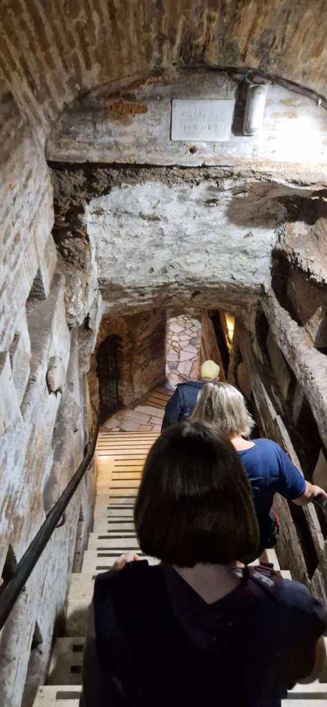 Heute wurden wir von einem Taxi abgeholt und zu den Katakomben San Calixtus gefahren. Die Entstehung der Katakomben hängt mit der Begräbniskultur zusammen. Die ersten christlichen Gemeinden in Rom hielten an der Körperbestattung fest, weil sie das Grab als Stätte der zukünftigen Auferstehung sahen.
